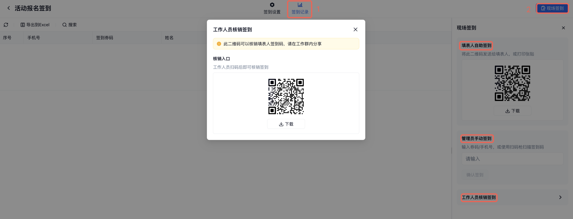 进入「签到记录」——「现场签到」板块,支持填表人自助签到、管理员手动签到或工作人员核销签到。
