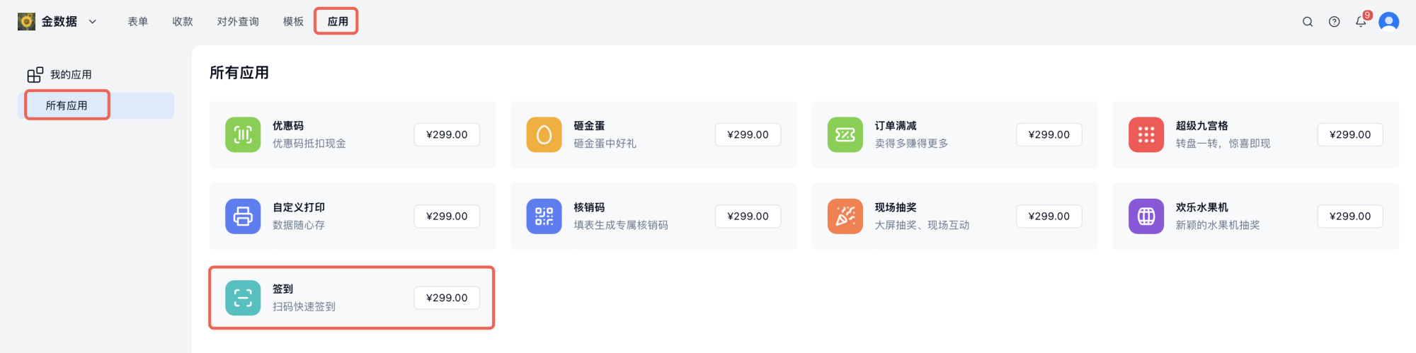 在「营销中心——所有应用」找到「签到」并点击进入详情页,选择「免费试用」,试用到期后,将无法进入应用,请及时购买。