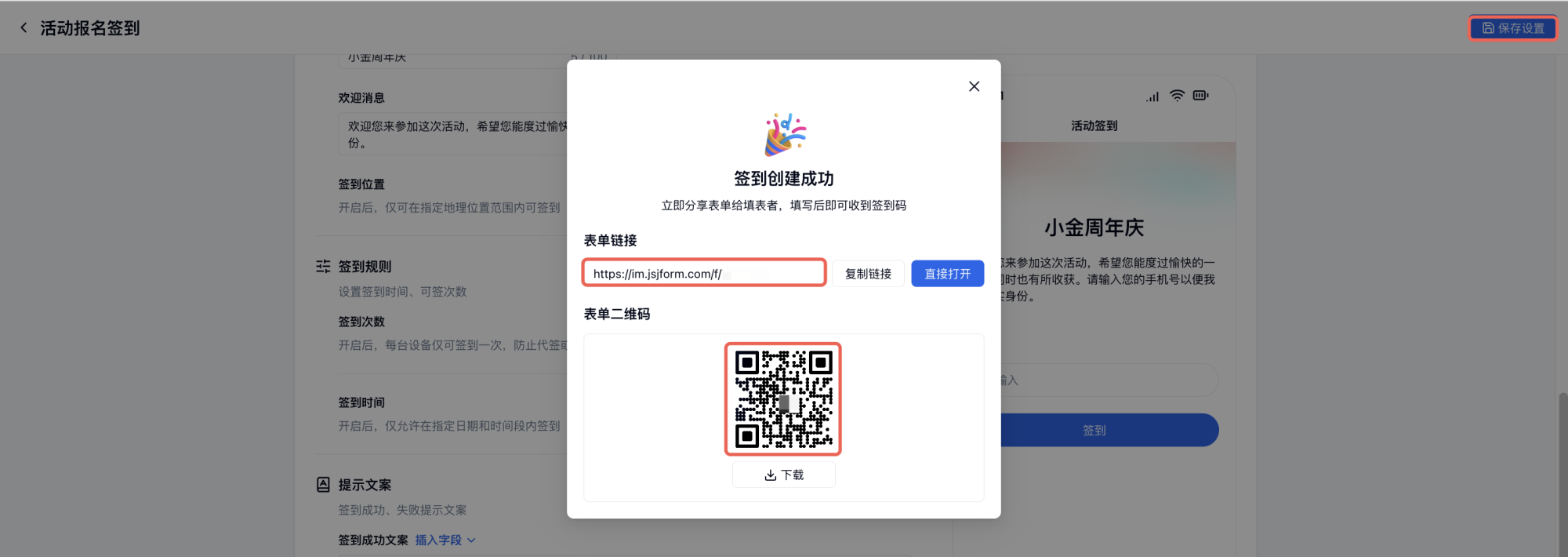完成上述配置后,点击右上角「保存配置」即可生效。系统将生成专属的表单链接与二维码,供你分发给参与者进行报名。