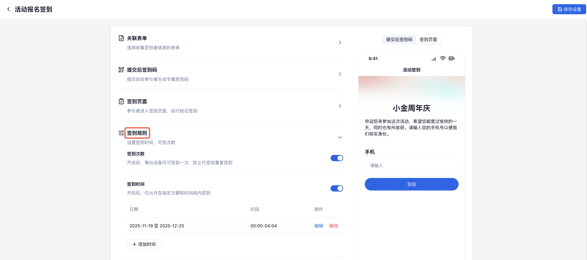 签到时间:开启后,点击「+ 添加时间」可设置指定日期及时间段,需注意所有时间段内一个手机号只能签到一次。