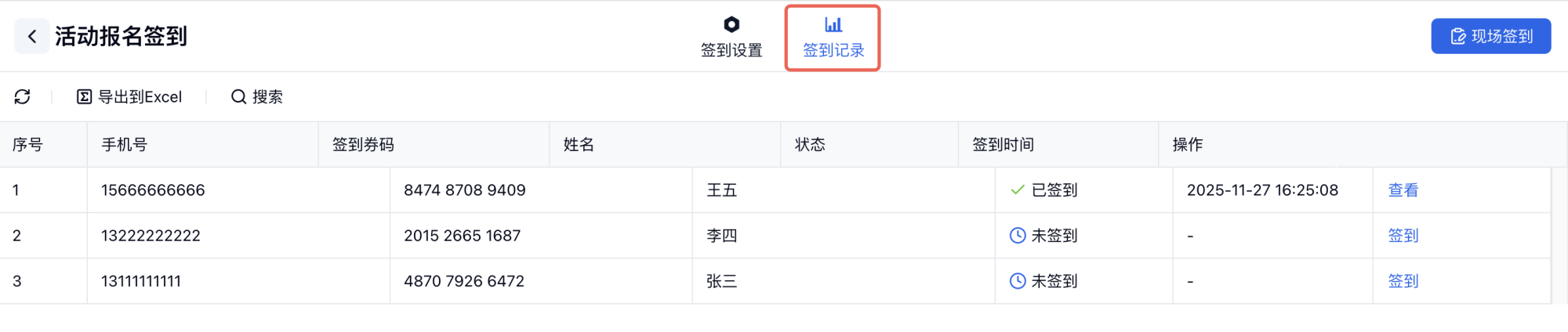 所有签到数据将实时同步更新,您可以清晰掌握每位参会者的签到状态。活动结束后,还可一键将完整的签到统计详情导出为Excel文件,便于存档与深度分析。