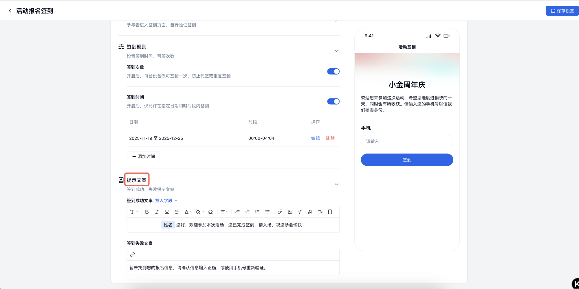 你可以根据业务需求,自定义签到成功与失败的提示信息。在成功文案中,支持通过插入表单字段(如:姓名、手机号)来生成包含参与者信息的个性化签到凭证。