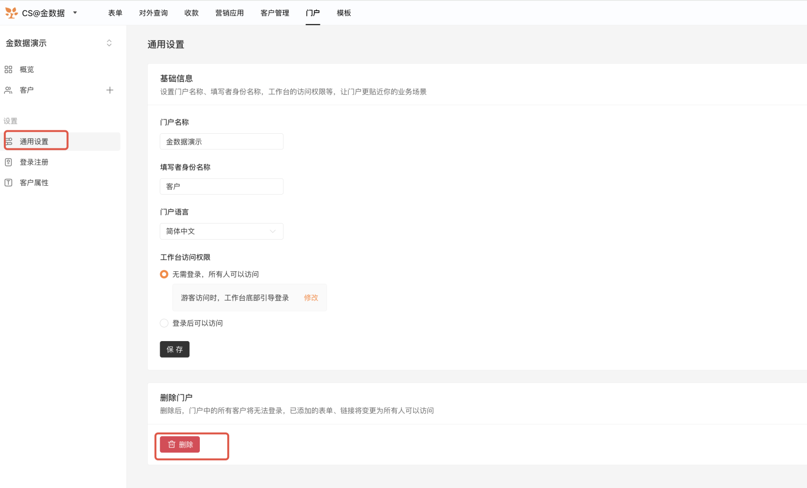 进入「门户」的「通用设置」,点击「删除门户」即可删除该门户。