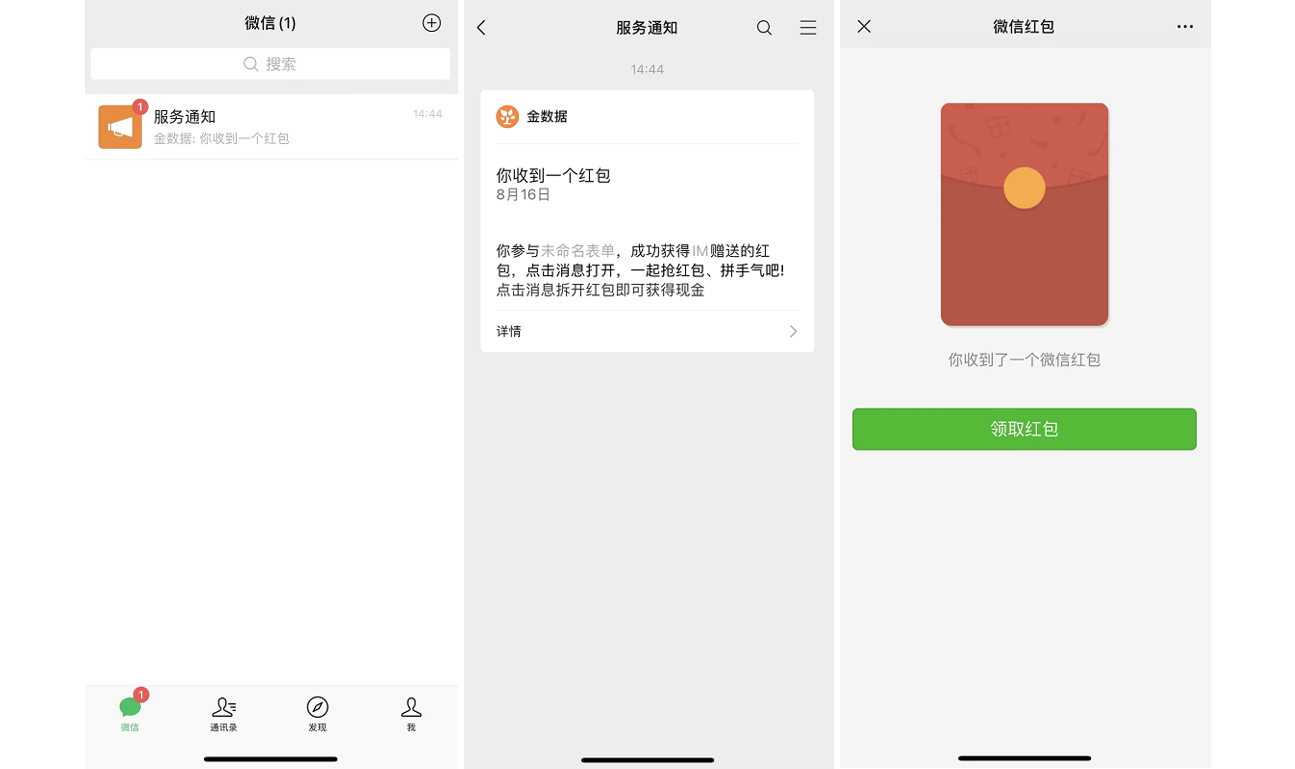 1.表单填写者的微信已经关注金数据公众号,就由金数据公众号推送微信红包,然后点击领取。