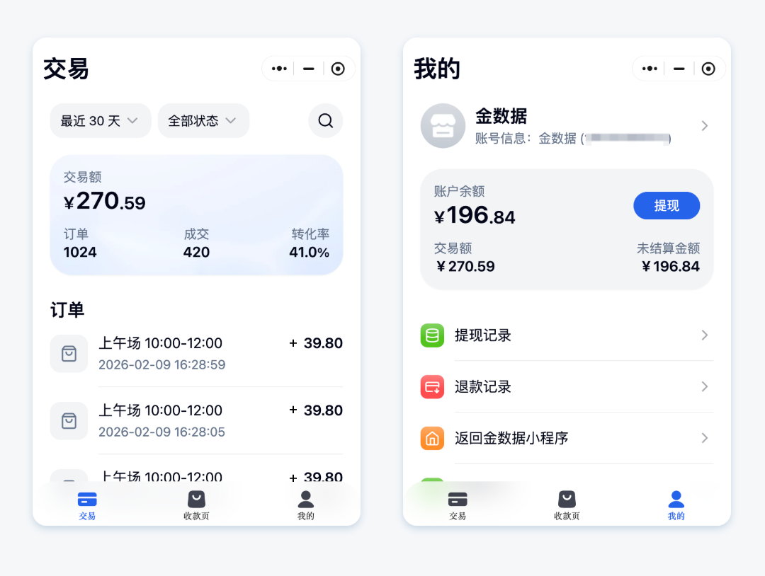 从创建收款页、发起交易,到查看订单、退款与提现,全部操作均可在「小金商户助手」小程序内完成。