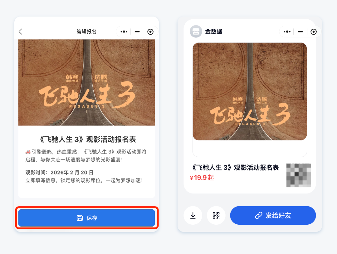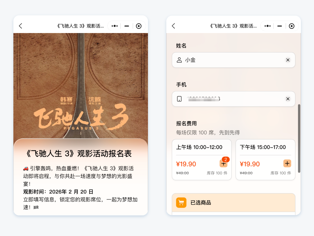 支持将链接、二维码发给好友、群聊,或嵌入公众号文章及朋友圈海报,扫码即可报名付款。