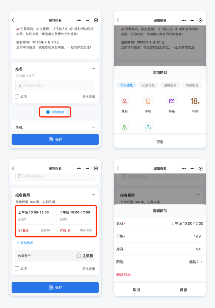 在「收款」页,点击「+」创建收款表单。在表单内添加姓名、手机等基础字段,并关键性地添加一个「商品字段」。在此字段中,设置商品名称,并标注价格、库存与限购。如活动包含多个价位,也可以添加多个商品。