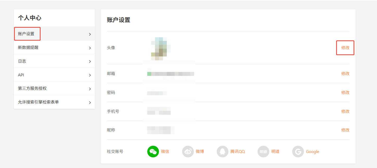 1)点击右上角的头像按钮,进入「个人中心—— 账户设置 」:
