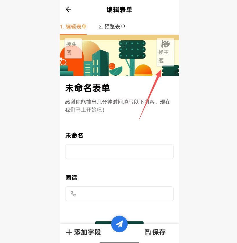 手机 App 进入编辑表单右上角可以更换主题。注意:手机 App 无法更换全局背景,需要在 PC 端进行操作。