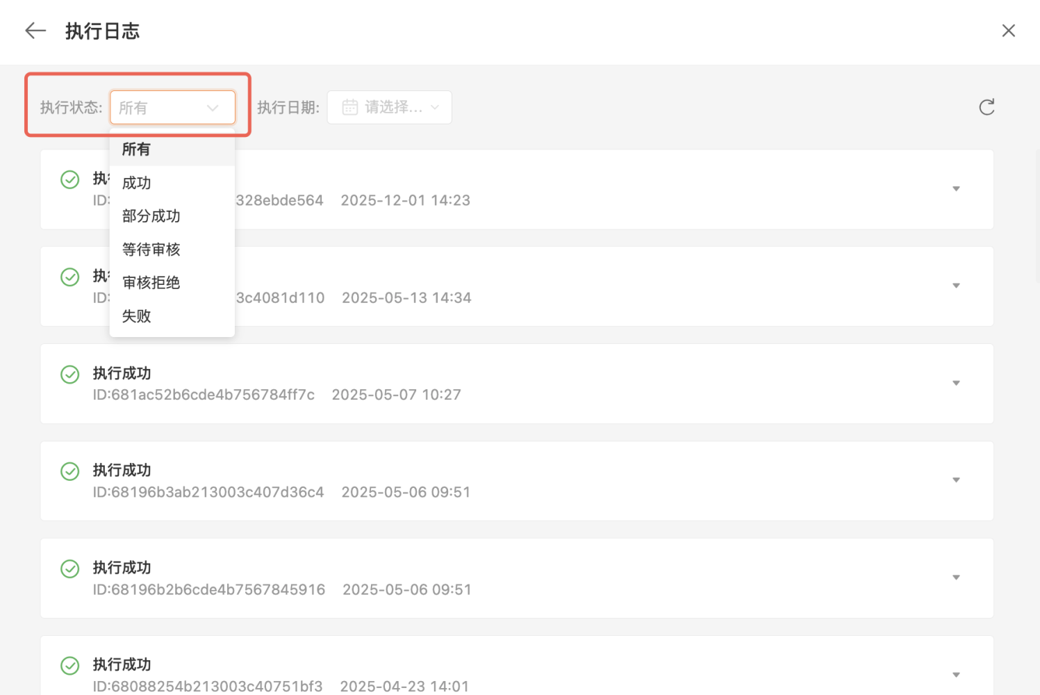 在表单「自动化——查看日志」,可根据执行状态筛选查看。