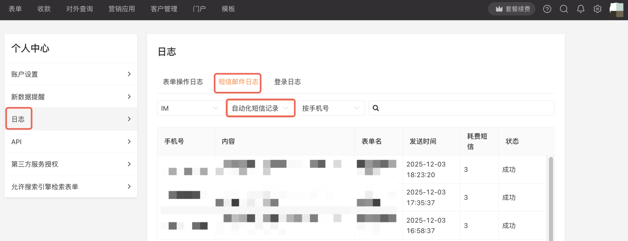 或者到「个人中心——日志——短信邮件日志——自动化短信记录」,支持筛选查看。