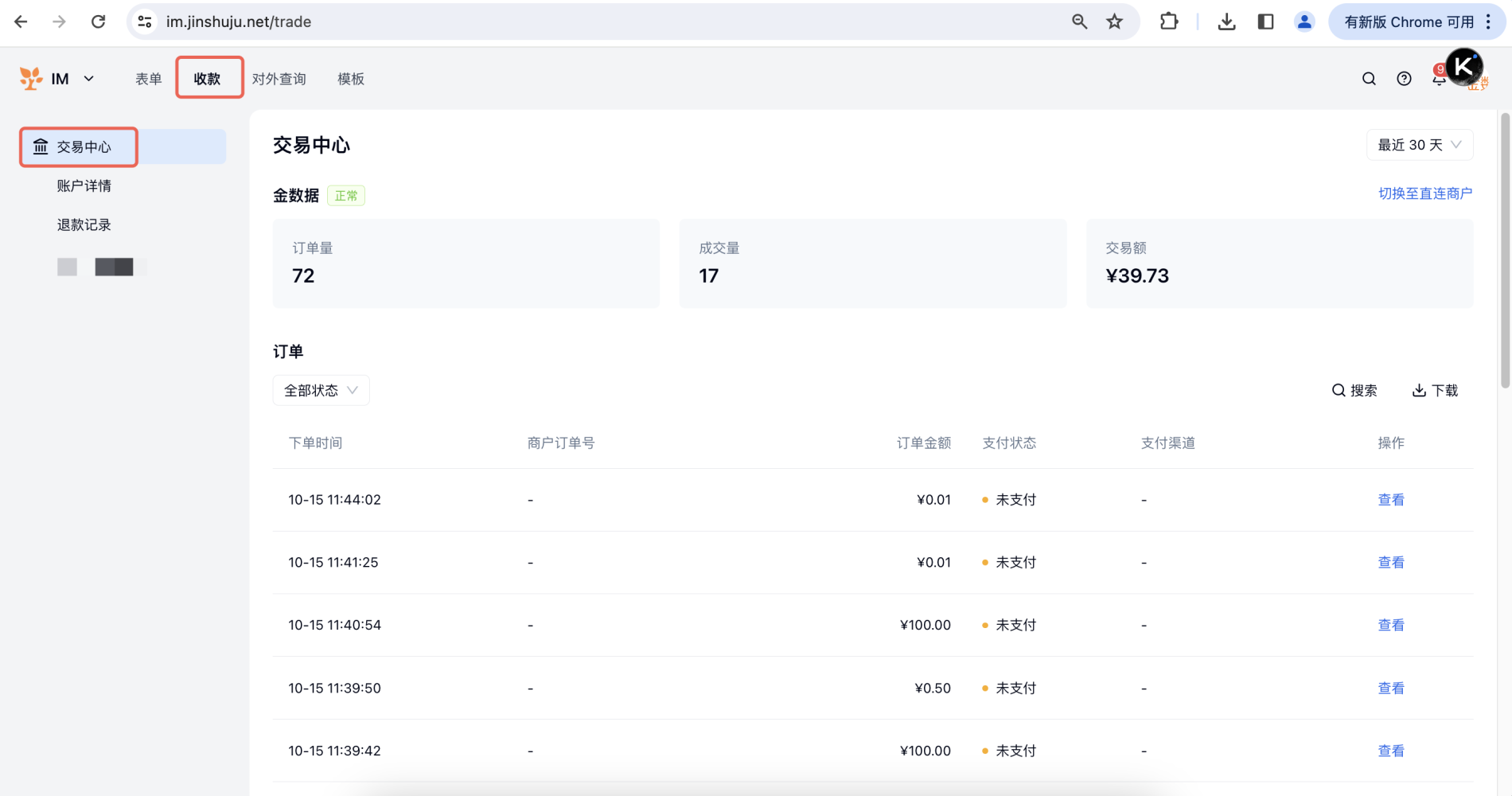 钱收到你开通的小金商户账户中,你可以在金数据的 收款 板块查看已支付订单。