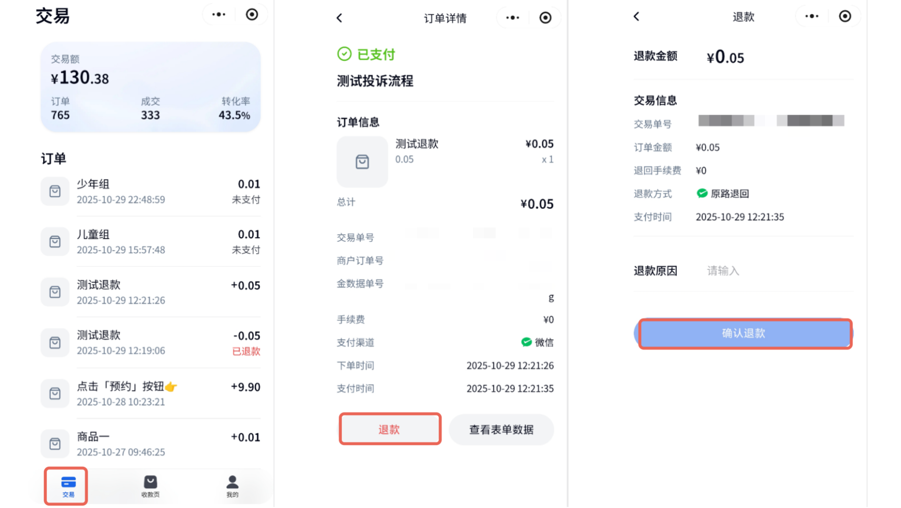 交易——点开需退款订单——退款——输入退款原因并「确认退款」——验证管理员手机号即可完成订单退款操作。