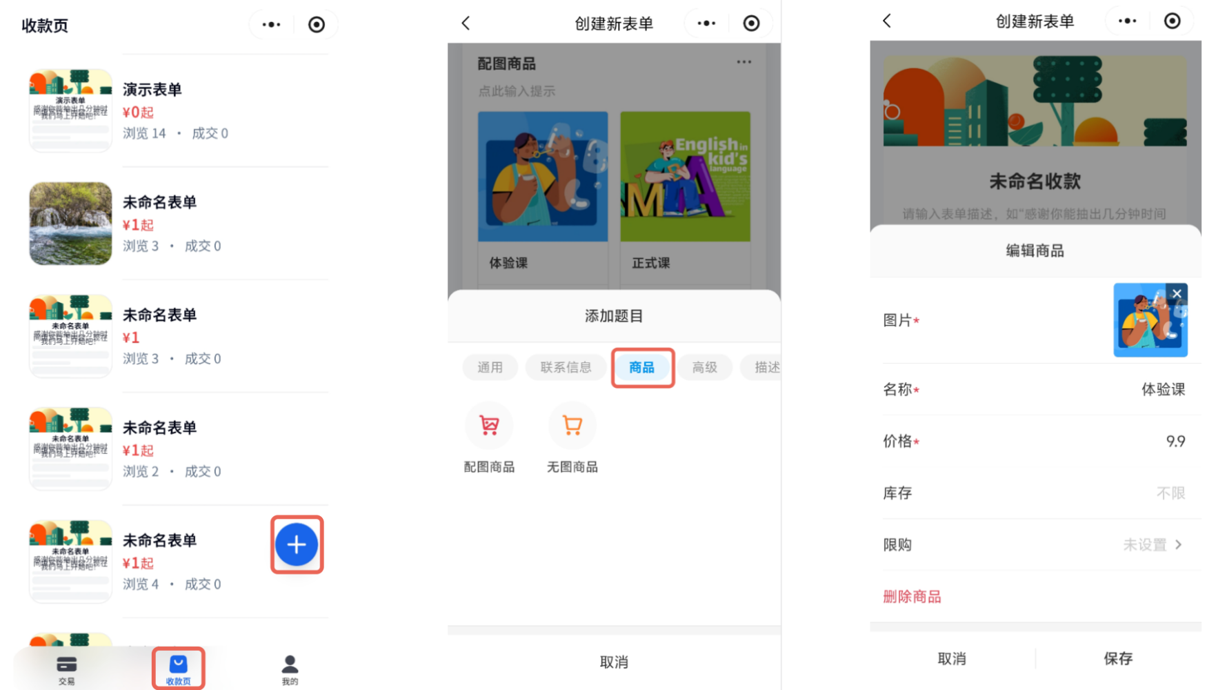 收款页——点击➕号——商品类题目可添加配图商品或无图商品——商品字段可设置价格、库存及限购数量等。新收款表单将自动关联账户下已开通的小金商户。
