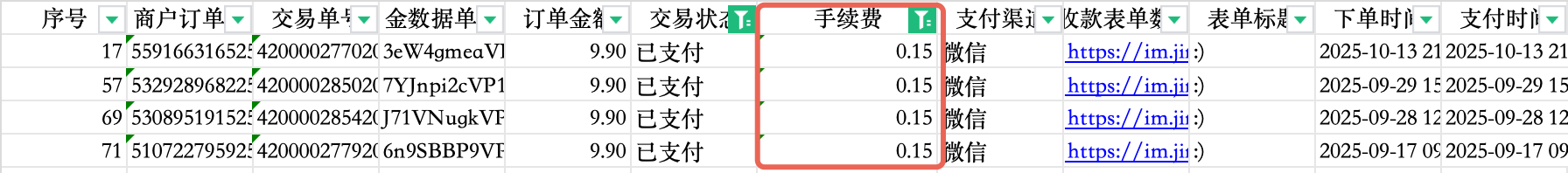 如需查看所有小金商户订单的手续费总额,可将时间切换为「全部时间」,下载订单号统计手续费总额。