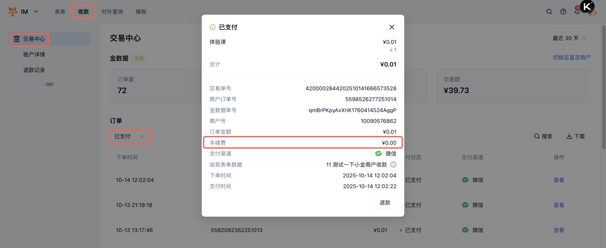 你可以在金数据 「收款——交易中心」 板块,点击订单查看按钮,查看该笔订单手续费。