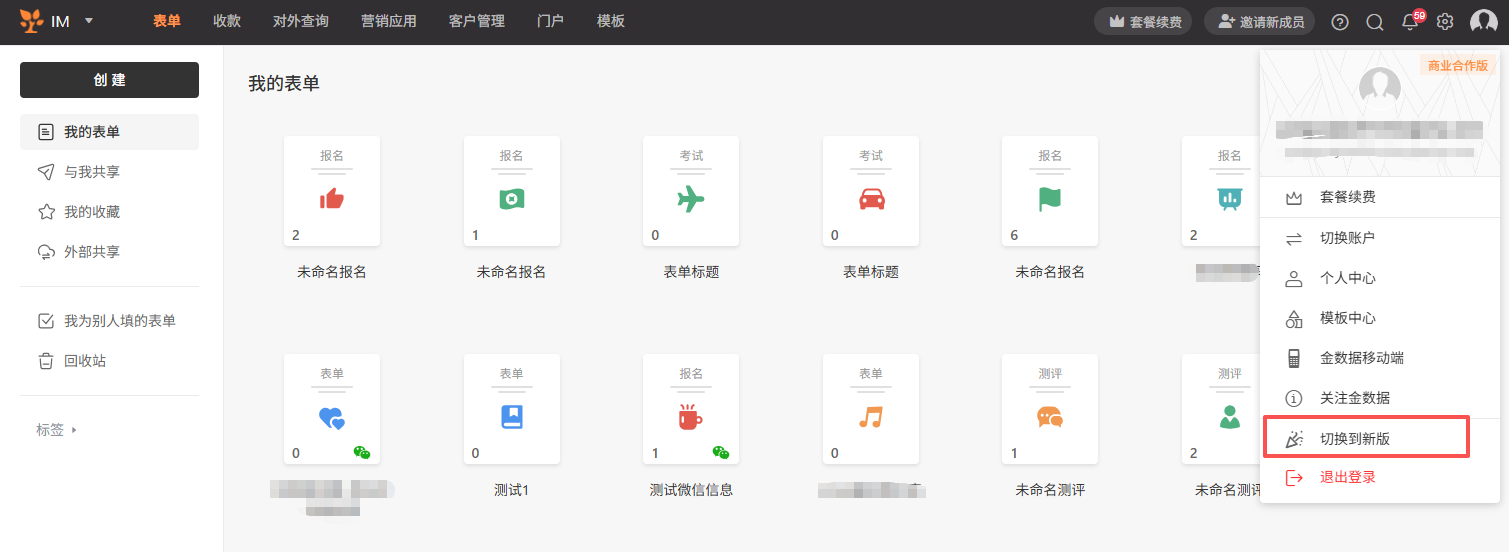 目前金数据已推出新版,如果你想在新版金数据创建表单、体验新功能,可以点击右上角小头像-切换到新版来使用。